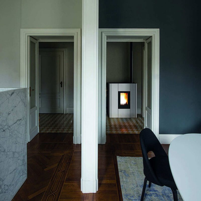 Le poêle à granulés Cortina un poêle plat design spécialement conçu pour les espaces réduits, sa façade se décline en céramique, en pierre ou en